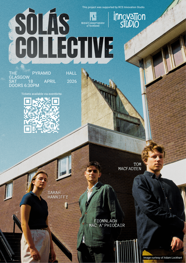 Sòlás Collective are the experimental trio of piper Fionnlagh Mac A’Phiocair, violist Sarah Hanniffy, and electronic musician Tom Macfadyen. They made their debut at Piping Live in 2024, and have since gone on to captivate audiences with their rich blend of Scottish and Irish traditional music and experimental electronics. Their practice of improvisation in their performances promises a one of a kind show, immersing the audience in a deep sound world with inflections of folklore, oral history, natural landscapes, Gàidhlig song, and everyday sounds.