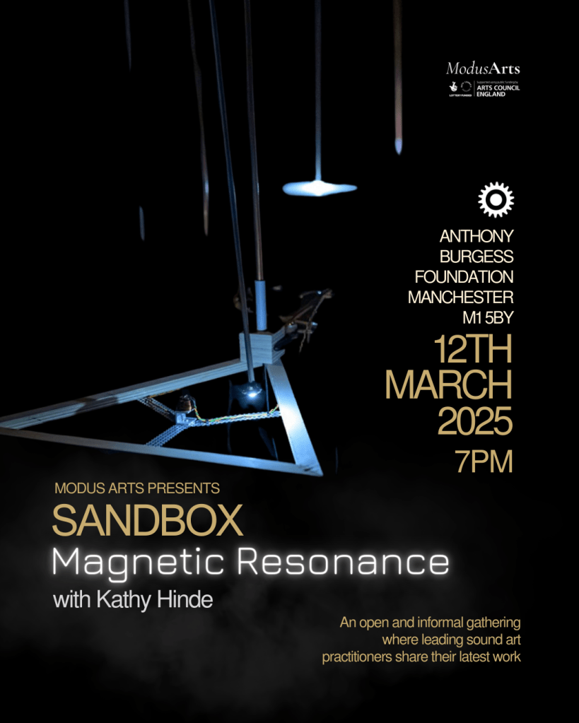 Kathy Hinde, will present her new work-in-progress Magnetic Resonance (in quadraphonic sound), a trio of illuminated sonic pendulums set into motion by the invisible push and pull of magnetic fields. The piece was developed on a research residency at iii (Instrument inventors) in The Hague. Kathy will share her process and inspirations behind the piece, drawn from the mysterious ways birds and other migratory species navigate using the earth’s faint magnetic field.